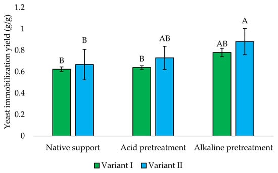 The yield of Y. lipolytica KKP 379 immobilization onto loofah sponge. Explanations: Variant I—1 g of loofah sponge was added at the beginning of culture; Variant II—1 g of loofah sponge was added after 48 h of culture. Error bars represent the standard deviation (SD) of three independent measurements. The values with the same uppercase letters (A, B) did not differ significantly (α = 0.05).