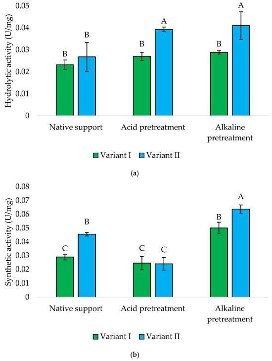 Hydrolytic (a) and synthetic (b) activities of Y. lipolytica KKP 379 immobilized onto a loofah sponge. Explanations: Variant I—1 g of loofah sponge was added at the beginning of culture; Variant II—1 g of loofah sponge was added after 48 h of culture. Error bars represent the standard deviation (SD) of three independent measurements. The values with the same uppercase letters (A–C) did not differ significantly (α = 0.05).