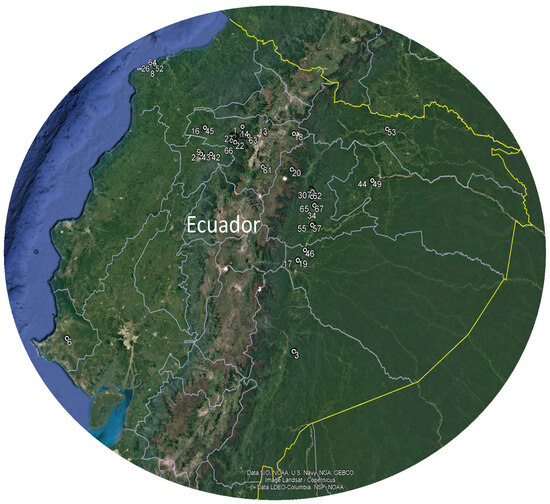For this study, 67 different flower species from tropical areas of Ecuador were selected (Table 1 and Figure 1) and collected throughout the year 2020. Thirty flowers were randomly sampled from each species and considered for physicochemical analysis. These were placed in containers provided with floral foam to prevent deterioration. At the same time, for other studies, approximately 200 g of petals were selected and carefully stored in Falcon tubes and subjected to lyophilisation using the Christ Alpha 1-4 LDplus apparatus (Martin Gefriertrocknungsanlagen GmbH, Osterode am Harz, Germany). In addition, fresh samples of flowers, leaves, stems, and fruits were collected, pressed, and dried for botanical identification in QUPS-Ecuador Herbarium. The physicochemical analysis included the determination of weight, equatorial and longitudinal diameters, soluble solids, pH, total titratable acid, moisture., and ash following the protocol of Coyago et al. [9].
