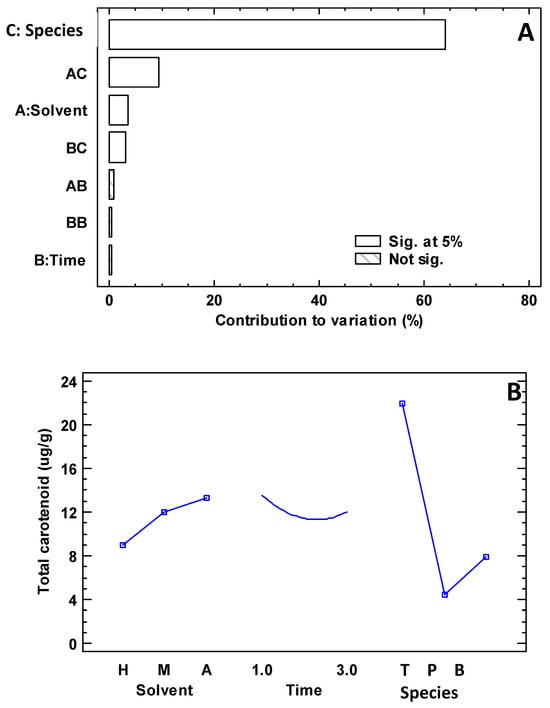 Results of the experimental design for the extraction of carotenoids. Note: In (A), the capital letters on the y-axis represent: A, solvent; B, time; C, species. In (B), the capital letters on the x-axis represent: H, n-hexane–acetone (1:1); M, methanol–acetone–dichloromethane (1:1:2); A, acetone–methanol (2:1); time in minutes; T, Taraxacum officinale; P, Pyrostegia venusta; B, Buddleja globose.