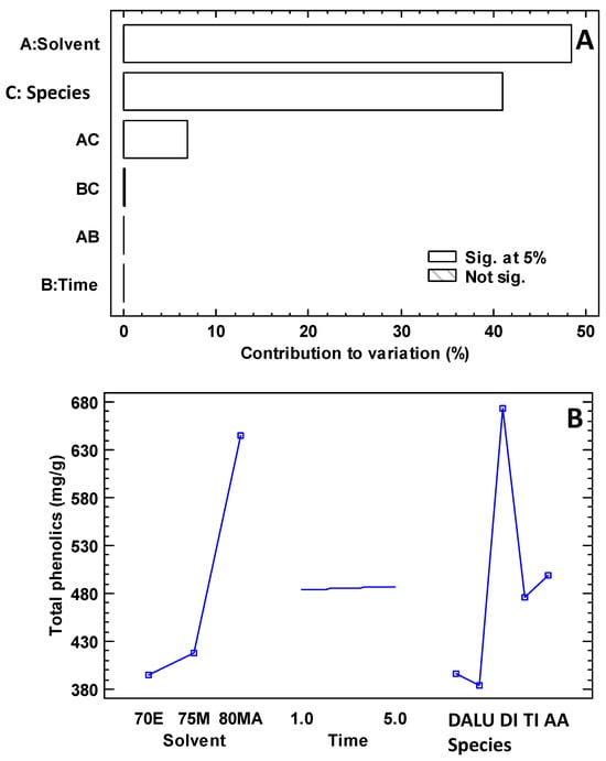 Results of the experimental design for the extraction of phenolics. Note: In (A), the capital letters on the y-axis represent: A, solvent; B, time; C, species. In (B), the capital letters on the x-axis represent: 70E, 75% ethanol; 75M, 75% methanol; 80MA, 80% methanol acidified with 0.1% hydrochloric acid; time in minutes; DA, Dahlia pinnata; LU, V; DI, Dianthus caryophyllus; TI, Plerona urvilleanum; AA, Agapanthus africanus.