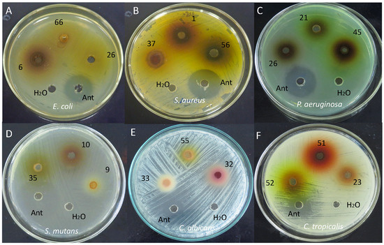 Antimicrobial activity of flower extracts against (A) Escherichia coli; (B) Staphylococcus aureus; (C) Pseudomonas aeruginosa; (D) Streptococcus mutans; (E) Candida albicans; (F) Candida tropicalis. Note: 1, M. erythrochlamys; 6, C. argentea; 9, P. fragrantissimum; 10, P. strictum; 21, G. nicaraguensis; 22, R. veitchii; 23, C. cornutus, 26, C. spiralis, 27, C. spiralis; 32, A. poiretii; 33, B. macrophylla; 35, E. americana; 37, G. ichthyoderma; 45, S. stromanthoides; 51, B. spectabilis; 52, E. aurantiacus; 55, M. erythrophylla; 56, M. philippica, 66, H. coccineum.