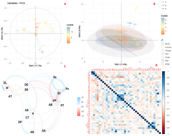 Figure 5A shows the principal component analysis (PCA) considering the visual colour of the flowers analyzed, while Figure 5B shows the PCA considering the total set of variables in the study. Figure 5C shows a correlation plot including all variables considered in the study, and Figure 5D shows the specific correlation plot for these variables.