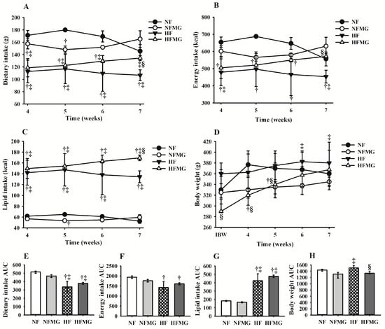Dietary intake (A), energy intake (B), lipid intake (C), body weight (D) and areas under the curve (E–H) in rats fed normal- or high-fat diets and treated or not with mangaba powder. NF: rats fed a normal-fat diet (n = 8); NFMG: rats fed a normal-fat diet with administration mangaba (n = 8); HF: rats fed a high-fat diet (n = 8); HFMG: rats fed a high-fat diet with administration mangaba (n = 8). AUC, area under the curve; IBW, initial body weight. † significant difference compared with NF; ‡ significant difference compared with NFMG; § significant difference compared with HF. Values are median to the 25th–75th percentiles (Kruskal–Wallis test and Tukey’s post hoc test, p ≤ 0.05), n = 8.