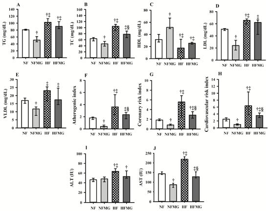 Final lipid profile (A–E), cardiovascular risk index (F–H) and transaminases (I,J) of rats fed normal- or high-fat diets after treatment with mangaba powder. NF: rats fed a normal-fat diet (n = 8); NFMG: rats fed a normal-fat diet with administration mangaba (n = 8); HF: rats fed a high-fat diet (n = 8); HFMG: rats fed a high-fat diet with administration mangaba (n = 8). AST, aspartate aminotransferases; ALT, alanine aminotransferases; TG, triacylglycerides; TC, total cholesterol; LDL, low-density lipoprotein; VLDL, very-low-density lipoprotein; HDL, high-density lipoprotein; IU, international unit. † significant difference compared with NF; ‡ significant difference compared with NFMG; § significant difference compared with HF. Values are median to the 25th–75th percentiles (Kruskal–Wallis test and Tukey’s post hoc test, p ≤ 0.05), n = 8.