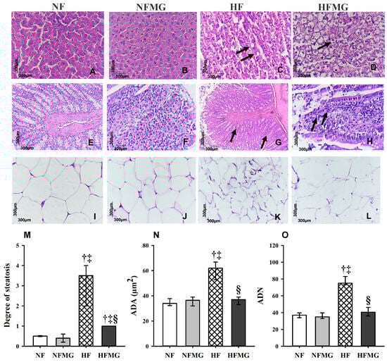 Histological analysis and morphometry of the liver, intestine and adipose tissue of rats fed normal- or high-fat diets after the treatment period with mangaba powder. (A): NF group (liver); (B): HF group (liver); (C): NFMG group (liver); (D): HFMG group (liver); (E): NF group (intestine); (F): HF group (intestine) (G): NFMG group (intestine); (H): HFMG group (intestine); (I): NF group (adipose tissue); (J): HF group (adipose tissue); (K): group NFMG group (adipose tissue); and (L): HFMG group (adipose tissue). Arrows indicate hepatocytes with clear cytoplasm and peripheral nuclei compatible with hepatic steatosis (C). Arrows indicate many mononuclear cells, such as macrophages and lymphocytes (G,H). Grade of steatosis (M); ADA, adipocyte area (N); ADN, adipocyte number (O). † significant difference compared with NF; ‡ significant difference compared with NFMG; § significant difference compared with HF. Values are median to the 25th–75th percentiles (Kruskal–Wallis test and Tukey’s post hoc test, p ≤ 0.05), n = 8.