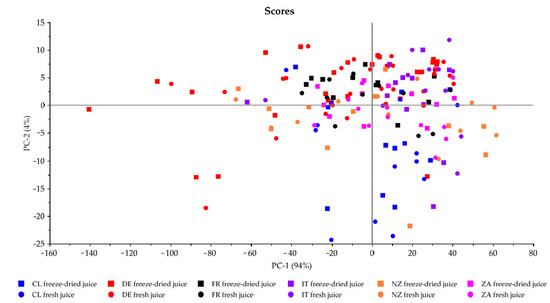 Subsequently, the elemental profile of the freeze-dried and fresh apple juice samples was analyzed according to Section 2.3.4. To evaluate whether the results of the two methods are comparable, an unsupervised principal component analysis (PCA) was performed. Before model creation, all elements showing values below the limit of quantification (LOQ) and above the calibration range were removed (excludes Li, Be, Na, Mg, Al, K, Sc, V, Cr, Ga, As, Se, Y, Zr, Ag, Cd, Sb, Te, Ce, Pr, Nd, Sm, Eu, Gd, Tb, Dy, Ho, Er, Tm, Yb, Lu, Hf, Ta, Ir, Tl, Pb, Th and U). The PCA is shown in Figure 2 using the elements B, Ca, Ti, Mn, Fe, Co, Ni, Cu, Zn, Rb, Sr, Mo, Ba and La. All freeze-dried samples are assigned as boxes, and all fresh samples are marked as dots. The different colors represent the different countries. It becomes apparent that the element distribution between the freeze-dried and the fresh apple juice samples is very similar, and no big deviations between the two groups are visible when looking at each country individually. Using an unsupervised method such as PCA is recommendable to visualize how the samples behave without labeling them. Since no separation of the two sample preparation methods was observed, the results of the two methods are comparable.