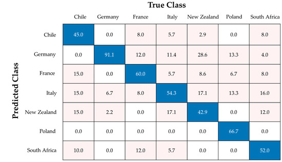 Confusion matrix showing the allocations of the test set for approach I (all countries) with a mean accuracy of 61.0%. Values are given in %. Right classifications are colored blue, wrong classifications are colored pink.