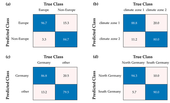 Confusion matrix of the test set showing (a) approach II with a mean accuracy of 90.9%; (b) approach III with a mean accuracy of 84.4%; (c) approach IV with a mean accuracy of 83.2%; (d) approach V with a mean accuracy of 92.3%. Values are given in %. Right classifications are colored blue, wrong classifications are colored pink.