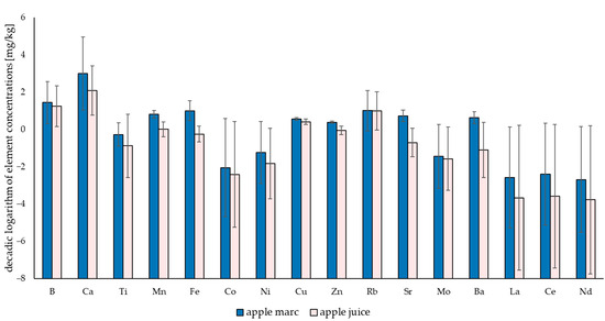 Comparison of the mean element concentrations of apple marc and apple juice samples showing the decadic logarithm of the element concentrations in mg/kg.