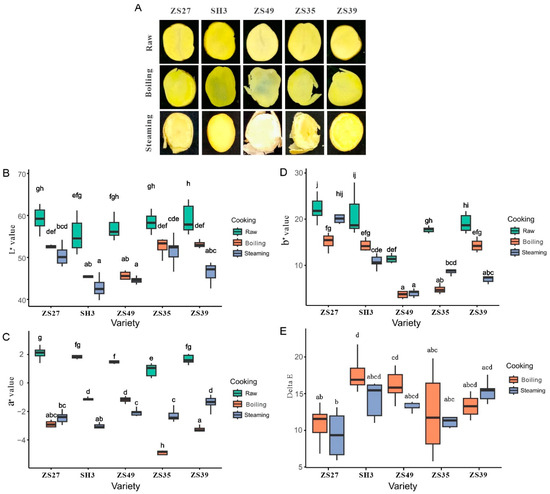 Figure 1D). Finally, no significant differences in total color difference (ΔE) were observed between the boiled and steamed potato varieties (