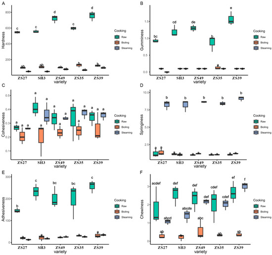 Figure 2A,B,E). These reductions suggest that both boiling and steaming soften the tuber structure, making them easier to chew and less sticky. However, cohesiveness remained unaffected by the cooking treatments, indicating that the internal structure of the tubers remained relatively stable in this aspect (