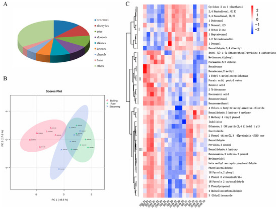 Group I included compounds like 2,4-heptadienal (E,E), 2,4-nonadienal (E,E), 1-decanol, and 1-dodecanol, which were present in low concentrations in raw samples but increased in both boiled and steamed samples. Those compounds may contribute to the development of rich, cooked aromas.