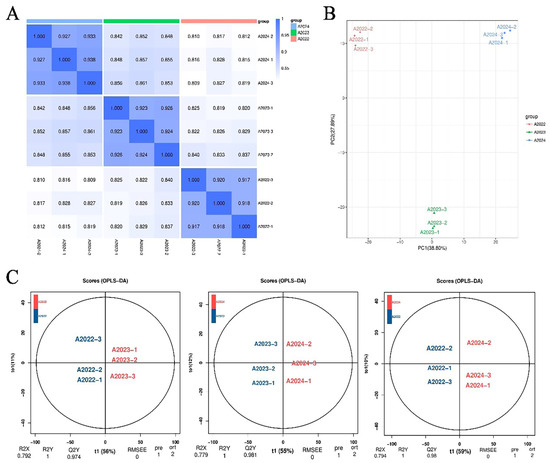 Data quality assessment of widely targeted metabolomics on Apocynum pictum honey from 2022 to 2024. (A) Correlation chart of widely targeted metabolomics on A. pictum honey from 2022 to 2024 samples from 2022 to 2024; (B) Widely targeted metabolomics analysis of all samples of A. pictum honey from 2022 to 2024 using PCA analysis; (C) Widely targeted metabolomics analysis of all samples of A. pictum honey from 2022 to 2024 using OPLS-DA analysis.
