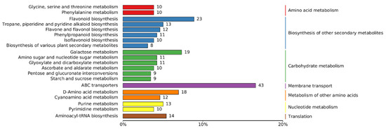 In order to better classify and analyze these metabolites, we annotated the metabolic pathways of these 1060 metabolites using KEGG (Kyoto Encyclopedia of Genes and Genomes) enrichment analysis. The top 20 metabolic pathways with the highest enrichment levels showed that A. pictum honey from 2022 to 2024, metabolites were mainly enriched in amino acid metabolism (glycine, serine, and threonine metabolism, phenylalanine metabolism), secondary metabolite biosynthesis (flavonoid synthesis, alkaloid synthesis, and other secondary metabolite synthesis), carbohydrate metabolism (amino sugar and nucleotide sugar metabolism, glyoxylate and dicarboxylate metabolism, ascorbate and aldarate metabolism, pentose and glucuronate interconversions, starch and sucrose metabolism), membrane transporters, other amino acid metabolism, nucleotide metabolism, and translation (Figure 2).