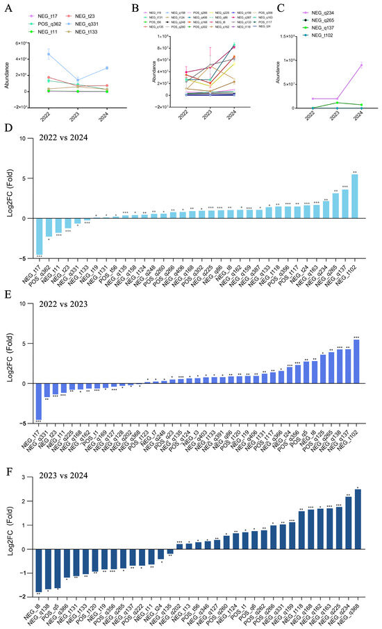 Changes in the content of sugar compounds in A. pictum honey from 2022 to 2024. (A) Sugar compounds with reduced content in 2024 compared to 2022; (B) Sugar compounds with a content increase of less than 2 times in 2024 compared to 2022; (C) Sugar compounds with a content increase of more than 2 times in 2024 compared to 2022; The sugar compounds with changes in content in A. pictum honey from 2022 to 2024 (D), 2022 to 2023 (E), and 2023 to 2024 (F) are ranked by quantity. The ones with the most significant decreases are placed on the far left of the graph, while the ones with the most significant increases are placed on the far right of the graph. The X axis represents the code of each compound, and the specific compound name referred to can be found in the attached table. Asterisks denote statistically significant differences (* p < 0.05; ** p < 0.01; *** p < 0.001).