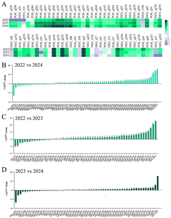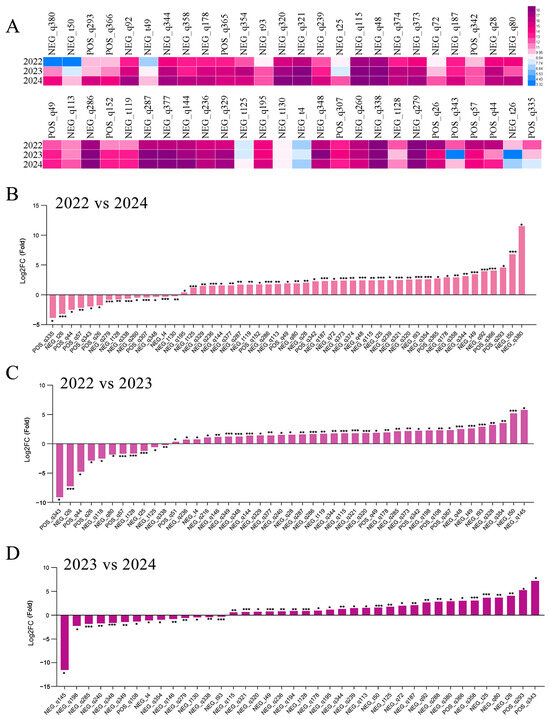 Changes in the content of flavonoids compounds in A. pictum honey from 2022 to 2024. Heat map of changes in flavonoid compound content with differences over the three-year period of 2022–2024 (A). The flavonoid compounds with changes in content in A. pictum honey from 2022 to 2024 (B), 2022 to 2023 (C), and 2023 to 2024 (D) are ranked by quantity. The ones with the most significant decreases are placed on the far left of the graph, while the ones with the most significant increases are placed on the far right of the graph. The X axis represents the code of each compound, and the specific compound name referred to can be found in the attached table. Asterisks denote statistically significant differences (* p < 0.05; ** p < 0.01; *** p < 0.001).