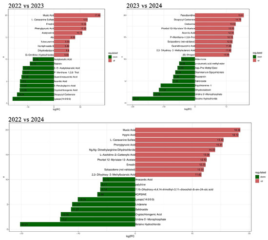 Similarly, it was found that from 2022 to 2023, a total of 45 flavonoids with changes in content were detected, of which 11 compounds showed a decrease in content (Figure 5, Table S4). Among these flavonoids with reduced content, robinin, camellia A, and 5,7-dihydroxyisoflavone showed significant reductions, reaching 9.14, 7.26, and 4.78 times, respectively. The changes in the remaining compounds such as hyperoside were not significant (Figure S2). Between 2023 and 2024, a total of 40 flavonoids were detected to have undergone changes in their levels. The content of 14 compounds decreased in 2024 compared to 2023. The most significant change was that the content of dihydrodaidzein decreased by 11.54 times compared to 2023. The remaining compounds did not decrease by more than three times. Lastly, we compared the differences in flavonoid content in A. pictum honey between 2022 and 2024. As a result, 51 flavonoids with altered content were found, of which 14 had decreased content. But we also found that the highest decrease reached 3.86 times. Finally, we compared the differences in flavonoid content in A. pictum honey between 2022 and 2024. As a result, 51 flavonoids with altered content were found, of which 14 had a decreased content. But we also found that the highest decrease reached 3.86 times. And most of the flavonoids with reduced content showed a decrease of less than two times. In summary, with the increase in storage time, the content of some flavonoids in A. pictum honey decreases, but the overall decrease in flavonoid content is not significant.