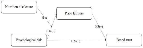 Studies have found that greater transparency of information lowers uncertainty, significantly impacting perceptions of price fairness [,]. Konuk [] found that price fairness is an essential determinant of consumer behavior concerning organic food. Masoud [] argued that consumers’ psychological risk negatively affects their perception of price, as the cost becomes more uncertain under unstable conditions, particularly in the context of online shopping. Similarly, Ventre and Kolbe [] posited that consumers’ risk perceptions lead to a negative impact on decision-making, as they are unsure whether the price is justified for the value of the goods being purchased. The provision of information is likely to improve perceptions of price fairness. A negative influence of risk on trust has been noted in the area of online commerce []. Similarly, Ha et al. [] examined autonomous vehicle consumers and found that psychological risk negatively affected trust. Jun [] found a significant negative association between psychological risk and brand trust employing Airbnb system users. Zadha and Suparna [] showed the negative impact of psychological risk on brand trust in digital banking services. Finally, Ali et al. [] reported a negative impact of risk on trust among fintech users. Against this background, this work proposes the following hypotheses: