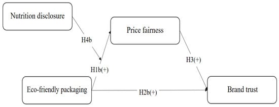 Figure 2 shows the second research model, in which eco-friendly packaging is an independent variable, price fairness is a mediator, and brand trust is the dependent variable. In addition, nutritional disclosure significantly moderates the effect of eco-friendly packaging on price fairness, and all variables are positively associated.