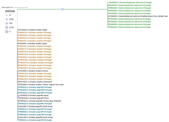 Phylogenetic tree constructed for Anisakis simplex, Anisakis pegreffii, and Hysterothylacium aduncum using 11 global reference strains. Phylogenetic analysis was based on the entire 950 bp ITS region. The tree was constructed using MEGA X software, employing the maximum likelihood method based on the Jukes–Cantor model. The robustness of the tree was assessed with 1000 bootstrap replicates. Samples from this study are indicated in bold. Samples indicated in orange represent A. simplex, in blue represent A. pegreffii and in green represent H. aduncum. Each sample is labeled with its species, GenBank accession number, and country of origin.