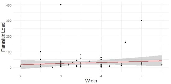 Scatter plot illustrating the relationship between fish width and parasitic load. The shaded region represents the confidence interval around the regression line.