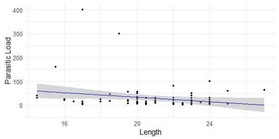Analyzing the relationship between fish length and parasitic load, we found a significant, but weak correlation (IC = −0.4072 to −0.0070; p-value = 0.0431). The p-value is less than the threshold of 0.05, which implies that as the length of the fish increases, the parasitic load tends to decrease (Figure 3).