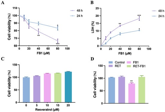 The TM4 cells were treated with 0, 10, 20, 40, and 80 μM FB1 for 24 h or 48 h. As seen in Figure 1A,B, FB1 significantly increased lactate dehydrogenase (LDH) levels and decreased cell viability in a time- and dose-dependent manner (Figure 1A,B). After 48 h, the cell proliferation inhibition rate reached the highest level (36.9%) in the 80 μM FB1 group. Then, the alleviating effects of the resveratrol on FB1-induced adverse effects were evaluated. Resveratrol alone could not cause significant changes in TM4 cell viability (Figure 1C). The resveratrol (15 μM) was applied in follow-up experiments. With resveratrol, FB1 (40 μM)-induced inhibition of cell proliferation was alleviated (Figure 1D).