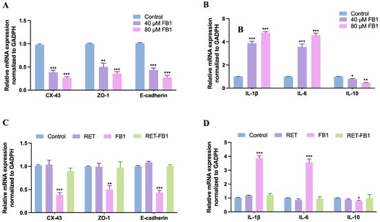 The Sertoli cell barrier, which is a barrier against foreign substances in the testis, was mainly composed of adhesin junctions (E-cadherin) and tight junctions (Zonula occludens-1, ZO-1 and Connexin 43, CX-43) between Sertoli cells. The mRNA expression levels of tight and adhesins junction proteins (CX-43, E-cadherin, and ZO-1) were obviously decreased when exposed to 40 μM and 80 μM FB1 for 48 h (Figure 2A). Furthermore, the mRNA expression levels of pro-inflammatory factors (IL-6 and IL-1β) were markedly enhanced. In contrast, the mRNA expression level of IL-10, an anti-inflammatory factor, was significantly reduced (Figure 2B). This suggested that FB1 might disrupt the cell barrier and induce an inflammatory response in TM4 cells. However, there were no significant differences in the levels of cell barrier proteins and inflammatory factors in the RET (15 μM)-FB1 (40 μM) group compared with the control group (Figure 2C,D). The results implied that resveratrol could mitigate FB1-caused cytotoxicity in TM4 cells.