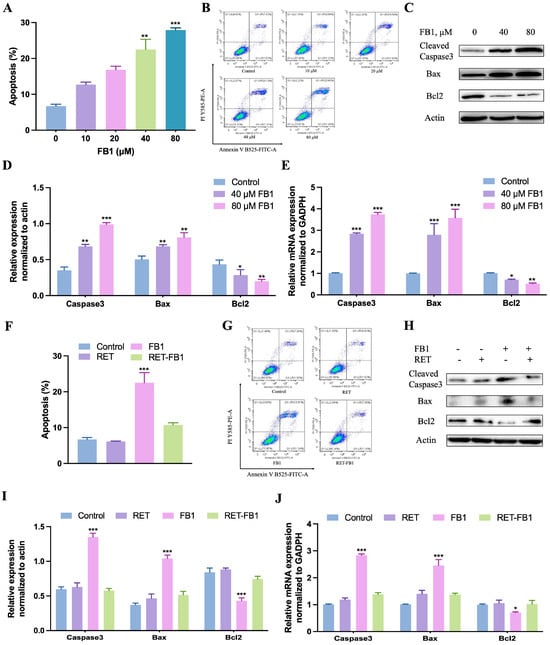 Resveratrol alleviated FB1-induced apoptosis in TM4 cells. (A,B) After treating TM4 cells with FB1 (0, 10, 20, 40, and 80 μM) for 48 h, the apoptosis rate was analyzed by flow cytometry. The expression levels of apoptosis-related genes were detected by immunoblotting (C,D) and real-time quantitative PCR analysis (E) after FB1 treatment for 48 h. (F–J) The effects of resveratrol (15 μM) on FB1 (40 μM)-induced apoptosis in TM4 cells. The quantification of the protein band was analyzed by Image J software. The data showed as the mean ± SD (* p < 0.05, ** p < 0.01, and *** p < 0.001).