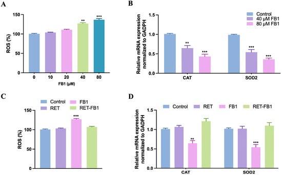 Resveratrol prevented FB1-induced oxidative stress in TM4 cells. The reactive oxygen species (ROS) were detected (A) by the ROS Assay Kit, and the mRNA expression levels of antioxidant enzymes were analyzed (B) by real-time quantitative PCR after FB1 treatment (0, 10, 20, 40 and 80 μM) for 48 h. (C,D) The effects of resveratrol (15 μM) on FB1 (40 μM)-induced oxidative stress in TM4 cells. The data showed as the mean ± SD (** p < 0.01 and *** p < 0.001).