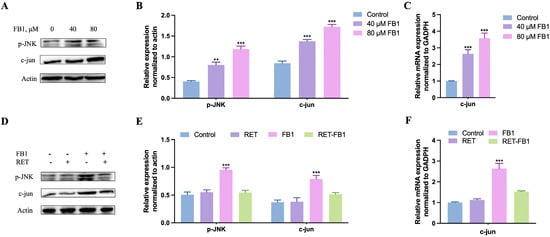 Resveratrol inhibited FB1-activated the JNK/c-jun signaling pathway in TM4 cells. Activation of the JNK/c-jun signaling pathway was detected by immunoblotting (A,B) and real-time quantitative PCR analysis (C) after FB1 treatment (40 μM and 80 μM) for 48 h. (D–F) The effects of resveratrol (15 μM) on FB1 (40 μM) activated the JNK/c-jun signaling pathway in TM4 cells. The quantification of the protein band was performed by Image J software. The data showed as the mean ± SD (** p < 0.01 and *** p < 0.001).