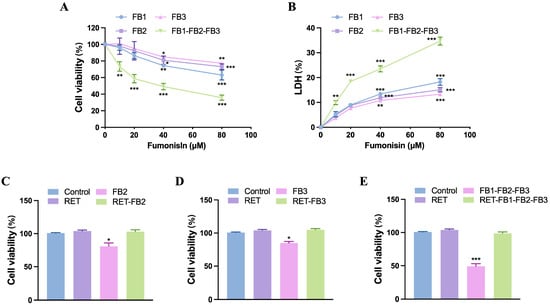 Fumonisin B2 (FB2) and Fumonisin B3 (FB3) are often present in feed and food together with FB1. This study is the first to investigate the cytotoxicity of FB2, FB3, and co-occurring three fumonisins in TM4 cells. As shown in Figure 6, a significant reduction in cell viability (Figure 6A) and a significant increase in LDH level (Figure 6B) were observed after FB2 and FB3-treated cells for 48 h, suggesting that FB2 and FB3 could induce Sertoli cell damage. The degree of cytotoxicity was significantly enhanced when three fumonisins were given simultaneously compared to mono treatment (Figure 6A,B), which also implied a synergistic effect of toxicity from the combined exposure of the three toxins. Resveratrol not only mitigated the cytotoxicity of FB2 and FB3 but also had a protective effect against the combined toxicity of FB1-FB2-FB3 (Figure 6C–E).