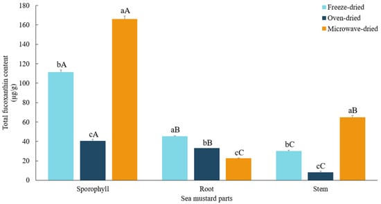 Total fucoxanthin content of sea mustard waste parts dried under different conditions. Small letters denote significant differences among different drying methods for each sea mustard part (a > b > c), while capital letters denote significant differences among the different parts of sea mustard for each drying condition (A > B > C) at the p < 0.05 level, according to Duncan’s multiple range test.