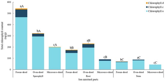 Chlorophyll contents of sea mustard waste parts dried under different conditions. Total vitamin chlorophyll content is equivalent to chlorophyll a + chlorophyll c + chlorophyll d. Small letters denote significant differences among different drying methods for each sea mustard part (a > b > c), while capital letters denote significant differences among the different parts of sea mustard for each drying condition (A > B > C) at the p < 0.05 level, according to Duncan’s multiple range test.