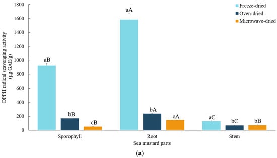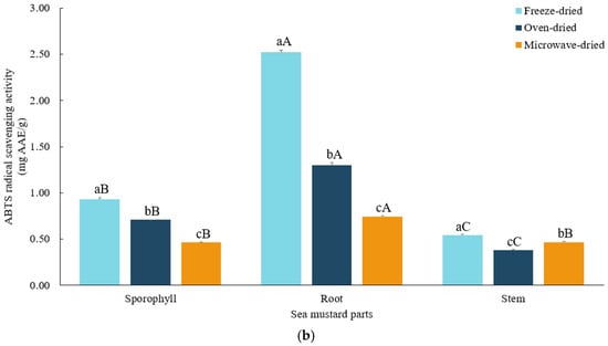 DPPH (a) and ABTS (b) radical scavenging activities of sea mustard waste parts dried under different conditions. The unit used for DPPH radical scavenging activity is micrograms of gallic acid equivalents per gram while the unit for ABTS radical scavenging activity is micrograms of ascorbic acid equivalents per gram. Small letters denote significant differences among different drying methods for each sea mustard part (a > b > c), while capital letters denote significant differences among the different parts of sea mustard for each drying condition (A > B > C) at the p < 0.05 level, according to Duncan’s multiple range test.