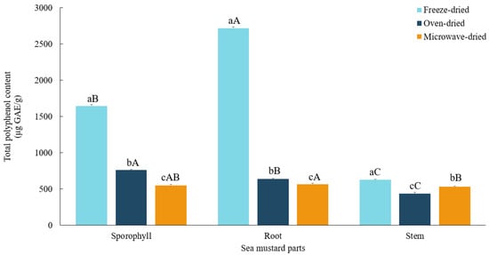 Total polyphenol contents of sea mustard waste parts dried under different conditions. The unit used is micrograms of gallic acid equivalents per gram. Small letters denote significant differences among different drying methods for each sea mustard part (a > b > c), while capital letters denote significant differences among the different parts of sea mustard for each drying condition (A > B > C) at the p < 0.05 level, according to Duncan’s multiple range test.