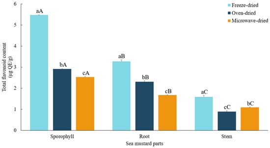 Total flavonoid contents of sea mustard waste parts dried under different conditions. The unit used is micrograms of quercetin equivalents per gram. Small letters denote significant differences among different drying methods for each sea mustard part (a > b > c), while capital letters denote significant differences among the different parts of sea mustard for each drying condition (A > B > C) at the p < 0.05 level, according to Duncan’s multiple range test.