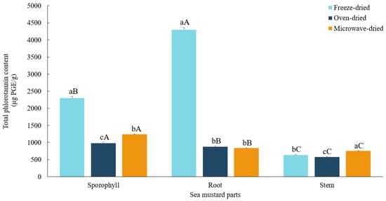 Total phlorotannin contents of sea mustard waste parts dried under different conditions. The unit used is micrograms of phloroglucinol equivalents per gram. Small letters denote significant differences among different drying methods for each sea mustard part (a > b > c), while capital letters denote significant differences among the different parts of sea mustard for each drying condition (A > B > C) at the p < 0.05 level, according to Duncan’s multiple range test.