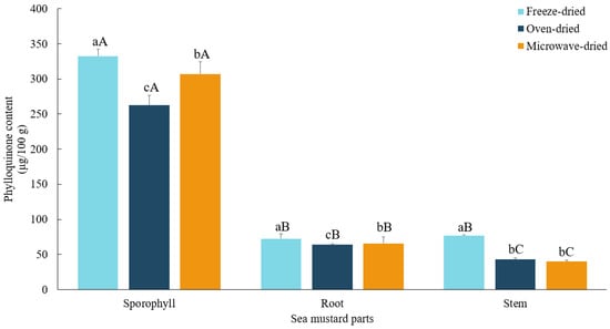 Phylloquinone contents (vitamin K1) of sea mustard waste parts dried under different conditions. The unit used is micrograms of phloroglucinol equivalents per gram. Small letters denote significant differences among different drying methods for each sea mustard part (a > b > c), while capital letters denote significant differences among the different parts of sea mustard for each drying condition (A > B > C) at the p < 0.05 level, according to Duncan’s multiple range test.