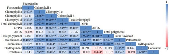 The sporophyll, which exhibited the darkest green color among the samples, contained the highest concentrations of fucoxanthin and chlorophyll. It also had the highest levels of phytomenadione and cobalamin among the sea mustard waste parts. In contrast, the root exhibited the highest antioxidant activity, along with elevated levels of total flavonoids, polyphenols, and phlorotannins. Antioxidant activities were positively correlated with the total polyphenol, flavonoid, and phlorotannin contents, while chlorophyll and fucoxanthin levels were positively correlated with flavonoid content.