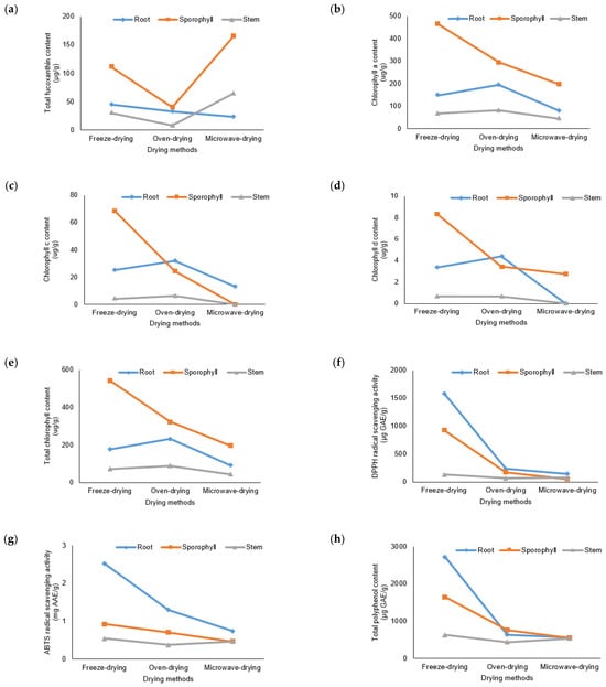 A similar trend was observed for ABTS radical scavenging activity, where both root and sporophyll showed approximately 70% and 50% reduction, respectively, when microwave-dried, with less reduction when oven-dried (48.5% and 23.7%, respectively). In contrast, the stem exhibited a lower retention rate when oven-dried compared to microwave-dried.