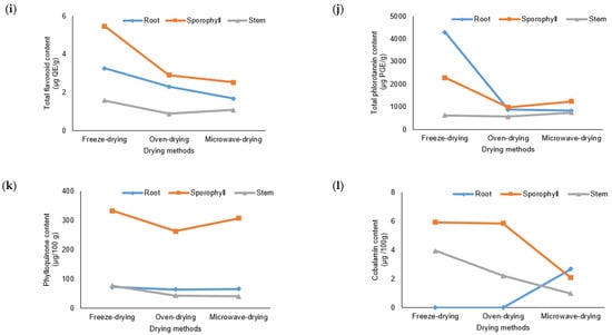In this study, significantly higher (p < 0.05) flavonoid content was found in freeze-dried sporophyll (5.47 ± 0.01 μg QE/g), followed by root (3.27 ± 0.07 μg QE/g) and stem (1.58 ± 0.08 μg QE/g) (Figure 6). Sporophyll had 1.3 to 1.7 times higher total flavonoid content compared to root and 2.3 to 3.5 times higher compared to stem across all drying methods. Despite its tough texture, sporophyll is rich in bioactive compounds with notable health benefits and is traditionally used in Chinese medicine [].