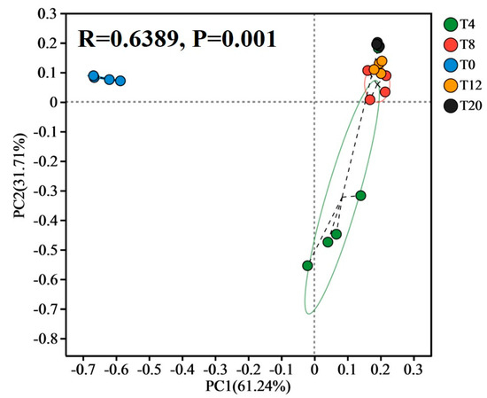 To investigate the effect of NaCl on bacterial composition, we analyzed the bacterial diversity by high-throughput sequencing. A coverage of 1.00 for each group was obtained, indicating that the sequencing results yielded adequate data to reflect the composition of microorganisms in Larou (Table 2). The ACE was used to reflect community richness, Shannon and Simpon were used to reflect diversity, and Shannoneven was used to reflect evenness [7]. No significant differences in ACE were found in all Larou, indicating that all groups were rich in microorganisms, whereas the bacterial diversity was significantly higher (p < 0.05) in T0, T4, and T8 than in T12 and T20. Distinctively, the community evenness of T4 was lower than that of T0, T8, T12, and T20, indicating that NaCl was able to influence microbial composition, especially at low NaCl concentrations.