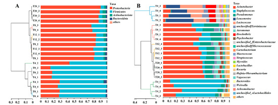 The bacterial composition of Larou with NaCl was significantly different from that without NaCl, as analyzed by PCoA (Figure 2). In addition, the NaCl also affected the bacterial composition of Larou, as evidenced by the fact that the bacterial composition of T4 was significantly different from that of T8, T12, and T20. T8 exhibited the highest similarity in bacterial composition to that of T12. The ASV from different Larou was taxonomized at the phylum and genus level. Taxonomical assignment at the phylum level revealed a total of 4 phyla. Protobacteria, Firmicutes, Actinobacteriota, and Bacteroidota were the major bacterial phyla in terms of relative abundance. All groups were detected for all four phyla, accounting for more than 99% of the overall abundance, except for T0, where Actinobacteriota was not detected (Figure 3A). Relative abundance of Firmicutes and Proteobacteria was significantly affected by NaCl concentration, with higher NaCl concentrations resulting in lower Firmicutes. Taxonomical assignment at the genus level revealed 23 genera with abundances greater than 0.01. Major differences were also observed in the genus-level composition of bacteria between the groups where NaCl was added (T4, T8, T12, and T20) and without NaCl (T0) (Figure 3B).
