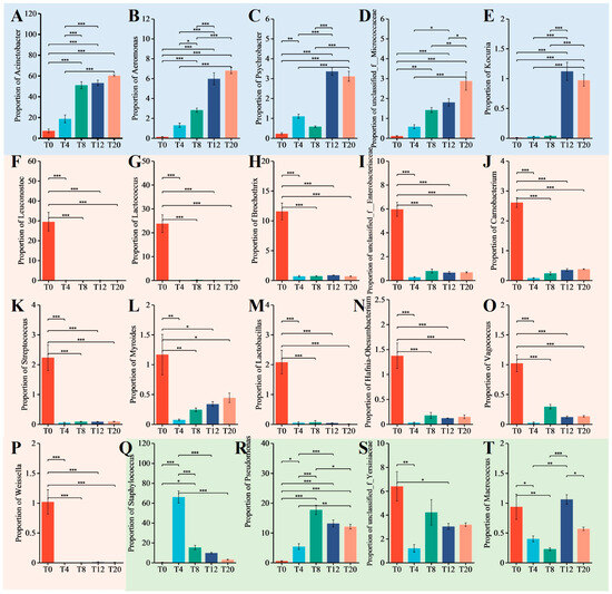 Kruskal–Wallis H test bar plot of bacterial community. Multiple validation corrections were made using false discovery rate (FDR) and post-hoc tests were made using Tukey–kramer (0.95). (A) Acinetobacter; (B) Aeromonas; (C) Psychrobacter; (D) Unclassified_f_Micrococcaceae; (E) Kocuria; (F) Leuconostoc; (G) Lactococcus; (H) Brochothrix; (I) Unclassified_f_Enterobacteriaceae; (J) Carnobacterium; (K) Streptococcus; (L) Myroides; (M) Lactobacillus; (N) Hafnia-Obesumbacterium; (O) Vagococcus; (P) Weissella; (Q) Staphylococcus; (R) Pseudomonas; (S) Unclassified_f_Yersiniaceae; (T) Macrococcus. * p < 0.05; ** p < 0.01; *** p < 0.001.
