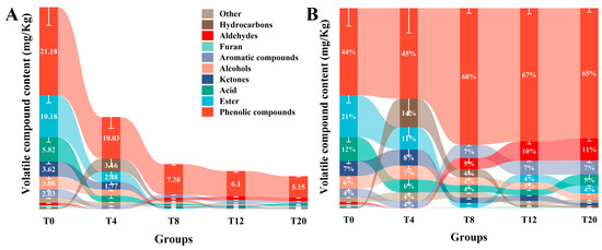 In terms of content, phenolic compounds, esters, and acids were the most abundant compounds (Figure 5A). Phenolic compounds are primarily derived from smoking and impart woody/smoky, green, fruity, sweet, and vegetable aromas to meat products [50]. Interestingly, the content of phenolic compounds continued to decrease with increasing NaCl concentration, from 21.18 mg/kg at T0 to 5.18 mg/kg at T20. It might be related to the high level of NaCl that weakened the mass transfer process on the bacon surface, and the dry surface formed by Larou prevented the adsorption of VOCs. Esters are generated by esterification of fatty acids with alcohols and by microbial metabolism, where short-chain esters (C1–C10) impart a fruity aroma to fermented meat products and long-chain esters produce the fatty flavor [51]. The content of esters remained relatively stable after decreasing from 10.18 mg/kg at T0 to 0.24 mg/kg at T8. The disappearance of some short-chain esters, such as 2,2-dimethyl-butanoic acid, methyl ester, hexanoic acid, ethyl ester, propanoic acid, and 2-hydroxy-ethyl ester, and the appearance of a number of medium and long-chain esters, such as 13-tetradecynoic acid, methyl ester, nonanoic acid, methyl ester, and 2-octyl-cyclopanetradecynoic acid, may be a specific indication of a change in Larou’s flavor. Medium- and long-chain fatty acids produced by lipase-catalyzed production of triglycerides and phospholipids, or short-chain fatty acids produced by pyruvate metabolism and lipoxygenase-catalyzed, are the main sources of acids [52]. NaCl appeared to intensely affect the content of acids, which significantly decreased from 5.82 mg/kg at T0 to 1.42 mg/kg at T4 once NaCl was added and then remained relatively constant.