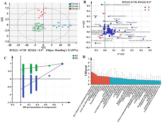 PLS-DA to analyze VOCs from Larou with different NaCl concentrations. (A) Score plot (R2X(cum) = 0.982, R2Y(cum) = 0.979, Q2(cum) = 0.877), (B) loading diagram, (C) permutation plot (N = 200) to check the validity and the degree of overfit for the PLS-DA, and (D) variable important in projection (VIP) values. The dashed lines in Figure C represent the connections between the original model and the Y-permuted models.