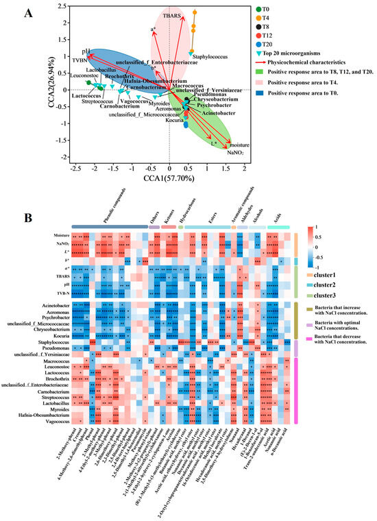 A series of biochemical, microbiological, and chemical changes will take place during the meat fermentation process, which will affect the taste, color, and aroma [56]. Therefore, it is important to analyze the correlation of PCs, bacterial diversity, and VOCs in Larou to investigate the role of NaCl in flavor. In this study, the RDA/CCA was used to explore the drivers (PCs) affecting the distribution of bacteria, and the correlation coefficients between VOCs with VIP > 1 and the top 20 abundance bacteria and PCs were analyzed using the Spearman correlation test, respectively. The results are shown in Figure 7. Consistent with the results of the PCoA and PLS-DA analyses, the chi-square distances distributed the five samples in different quadrants and classified them into three categories, with T0 (category 1) being distributed in the second and third quadrants, T4 (category 2) in the fourth quadrant, and T8, T12, and T20 (category 3) in the first quadrant. In addition, TVB-N, pH, b*, and a* values were distributed in the third quadrant, TBARS in the second quadrant, and L*, NaNO2, and moisture content in the first quadrant. Lactococcus, Leuconostoc, Lactobacillus, Streptococcus, Brochothrix, Carnobacterium, Hafnia-Obesumbacterium, unclassified_f_Enterobacteriacea, Vagococcus, Myroides, unclassified _f_Yersiniaceae, and Macrococcus were found to be closest to category 1 (T0), which indicated that TVB-N, pH, b*, and a* affected their distribution at a low NaCl concentration (<4%), especially TVB-N and pH. In particular, Staphylococcus was closest to category 2 (T4), and the angles to both TBARS and a* were acute, demonstrating that, at a medium NaCl concentration (~4%), TBARS and a* were PCs that affected the distribution of Staphylococcus, especially TBARS. In contrast, Kocuria, Aeromonas, unclassified_f_Micrococcaceae, Acinetobacter, Psychrobacter, and Pseudomonas were closest to category 3 (T8, T12, and T20), demonstrating that L*, NaNO2, and moisture content were the PCs that affected the distribution of those bacteria, especially NaNO2 and moisture content, at a high NaCl concentration (>4%).