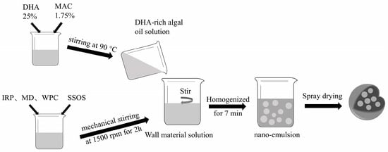 Docosahexaenoic acid (DHA, triglyceride type, ≥35%) from microalgae was purchased from Shandong Holy Leaf Biotechnology Co., Ltd. (Heze City, China). Infant rice powder and commercial DHA-rich algal oil powder (DHA, triglyceride type, 10%) were a kind gift from Jiangxi Guanglai Health Industry Co., Ltd. (Zhangshu, Jiangxi, China). Maltodextrin (MD, 15 < DE value < 20) was purchased from Henan Yimeike Biotechnology Co., Ltd. (Zhengzhou, Henan, China). Whey protein concentrate (WPC80, ≥99%) was purchased from Fonterra Co-operative Group Ltd. (Auckland, New Zeeland). Sodium starch octyl succinate (SSOS, ≥99%) was purchased from Shanghai Xintai Food Company (Shanghai, China). Monoglycerides (MAC, ≥90%) were purchased from Henan Wanbang Chemical Technology Co., Ltd. (Zhengzhou, Henan, China). All the other reagents were of analytical grade and used without further purification.